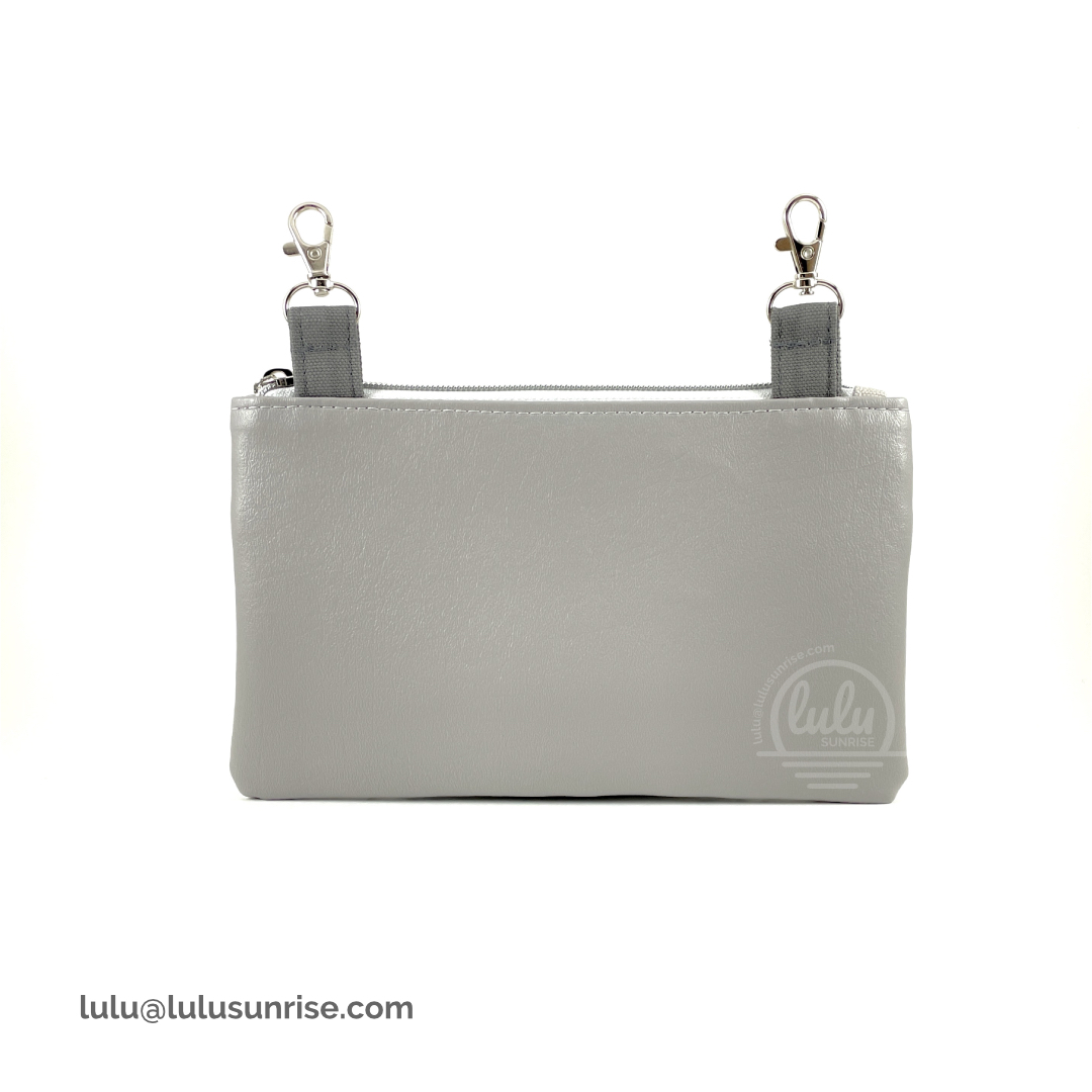 Vegan leather, lined with polyester fabric, metal lobster clasp, zipper.