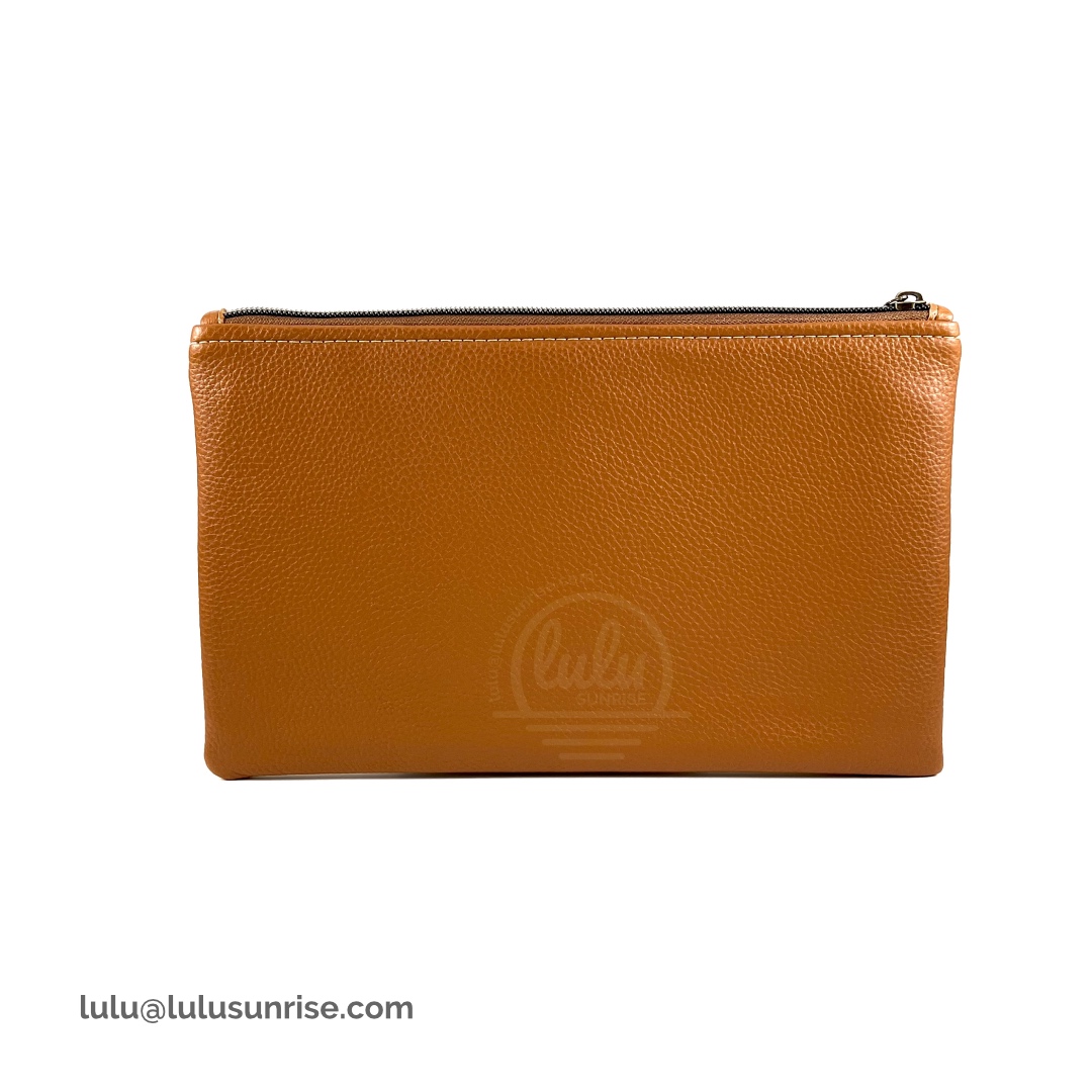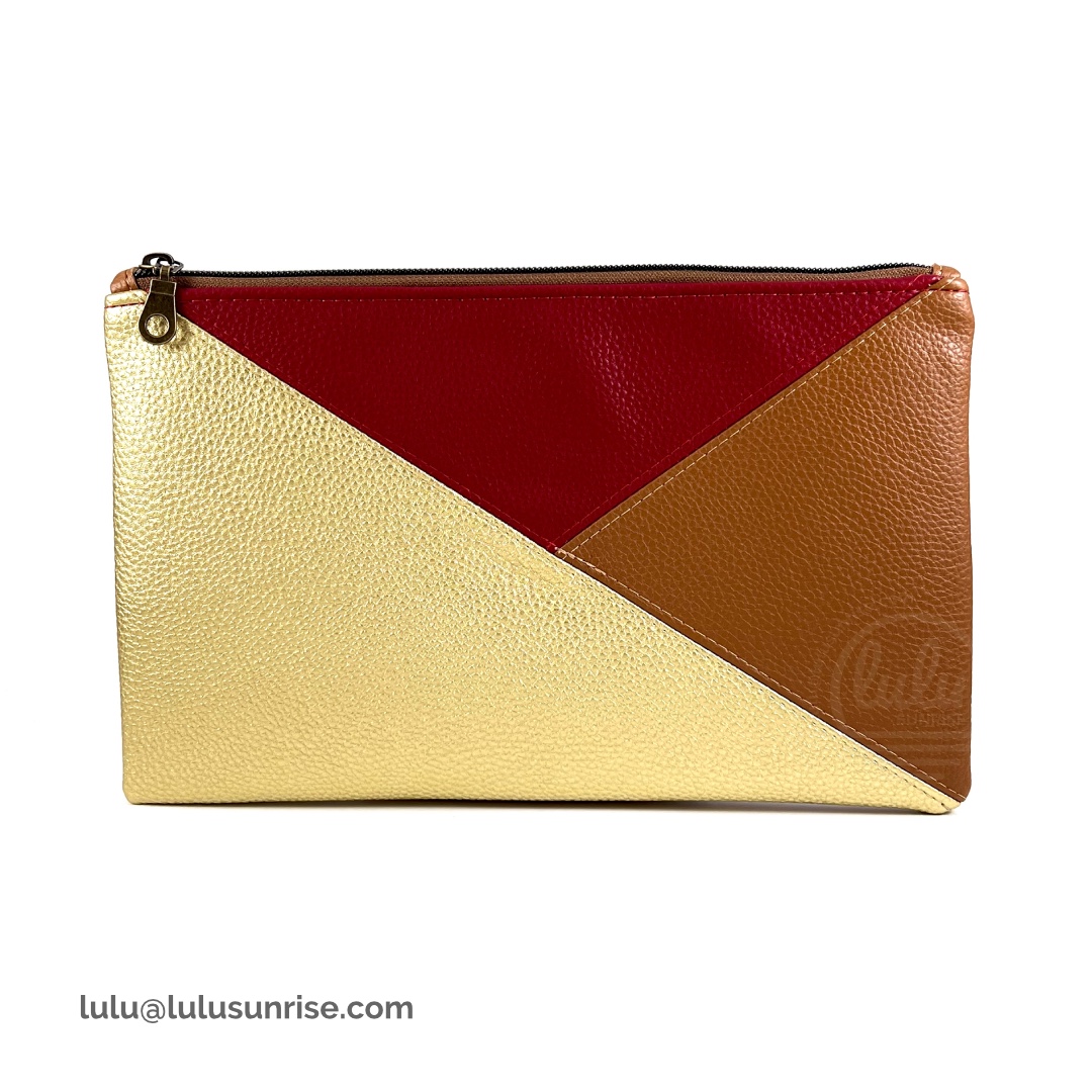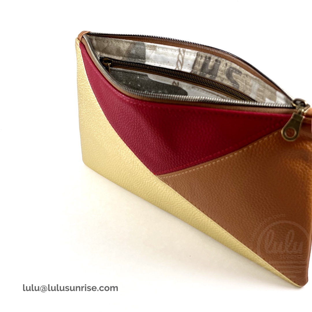 Outside vegan leather, zipper closure, fabric lined, inside zipper pocket.