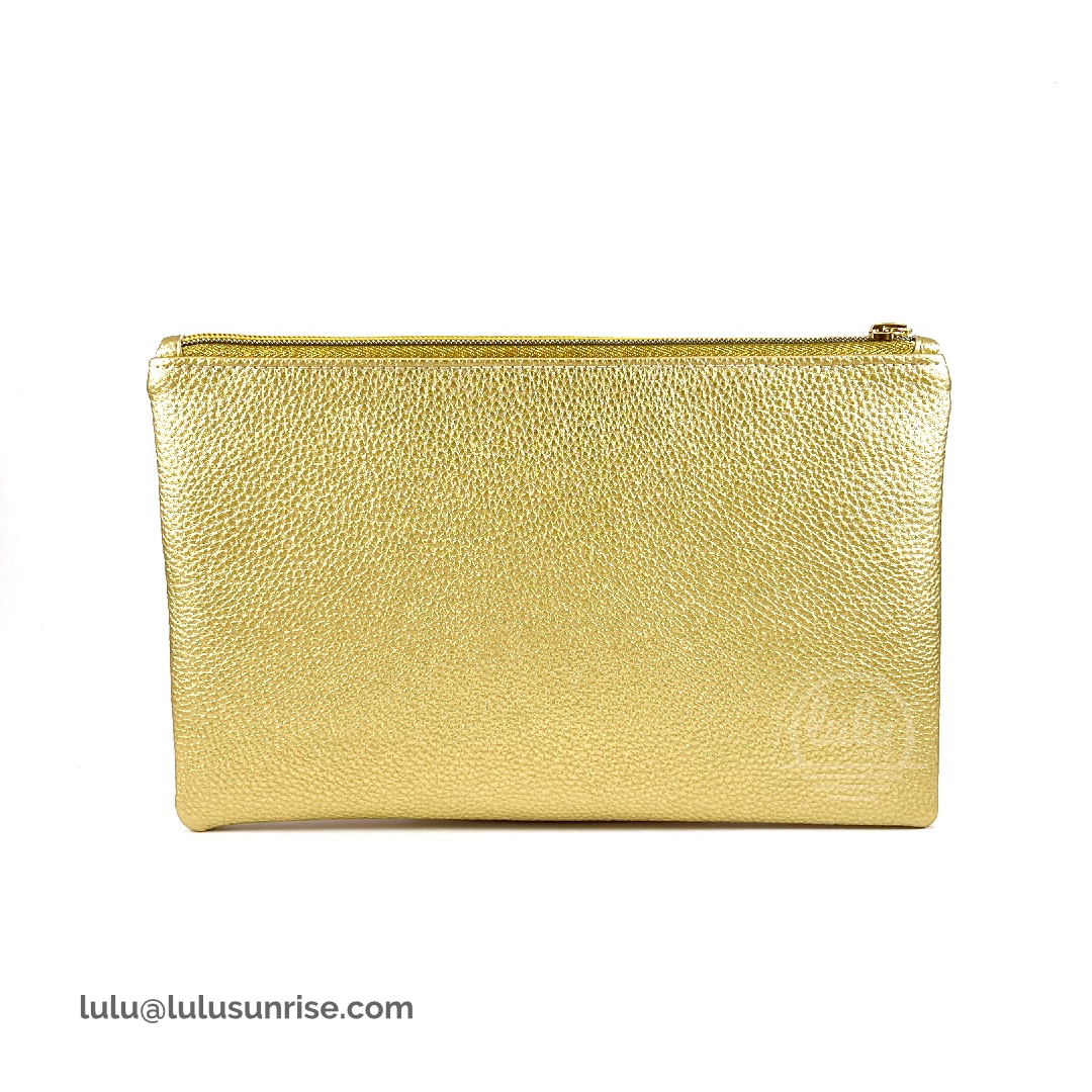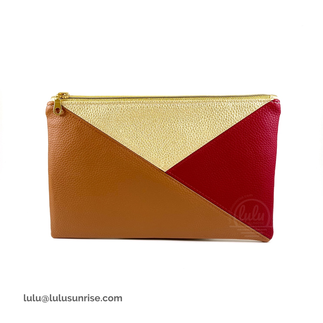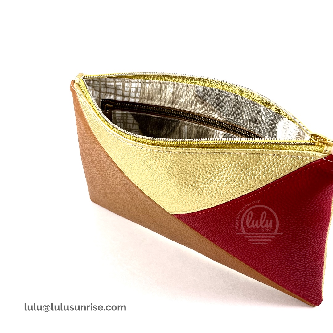 Outside vegan leather, zipper closure, fabric lined, inside zipper pocket.