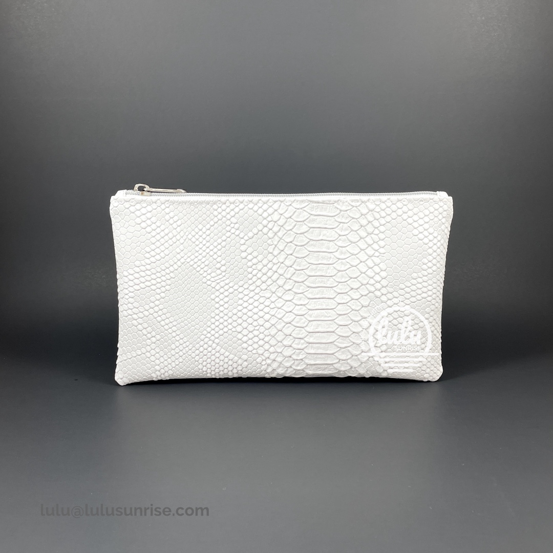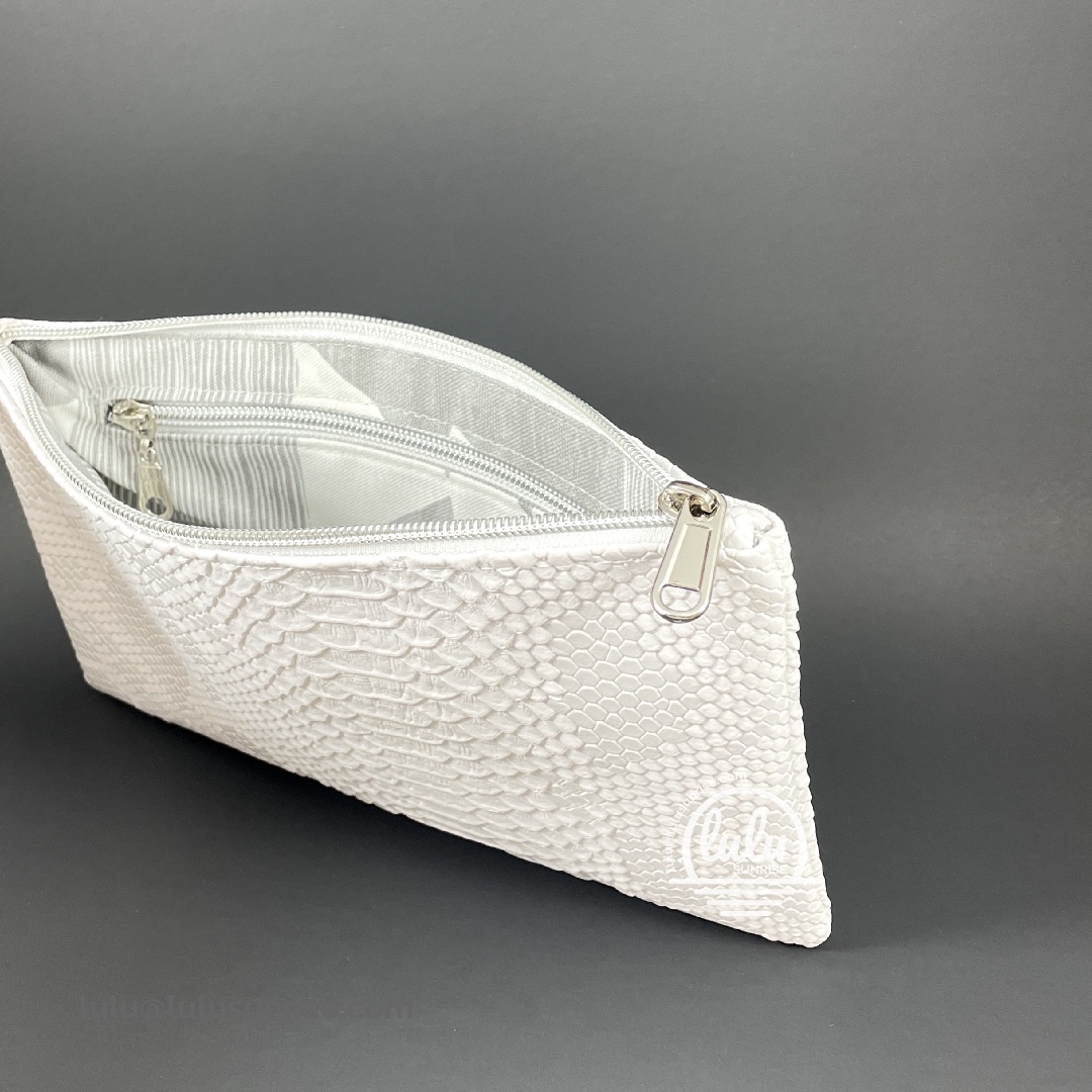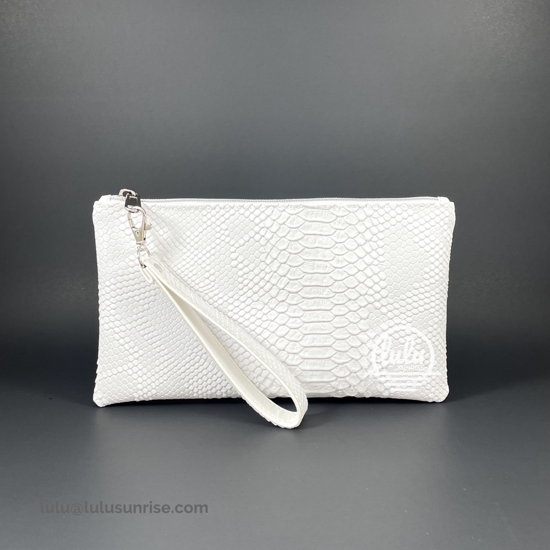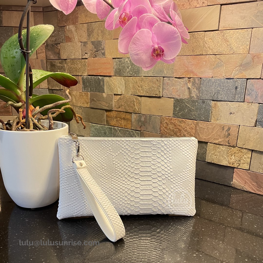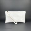 Outside vegan leather, zipper closure, fabric lined, inside zipper pocket, removable wrist handle.